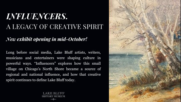 “Influencers” opens October 19 at Lake Bluff History Museum, 127 E. Scranton Avenue, Lake Bluff. Museum hours are Monday through Thursday from 1 to 4 pm and Friday and Saturday from 10 am to 1 pm.